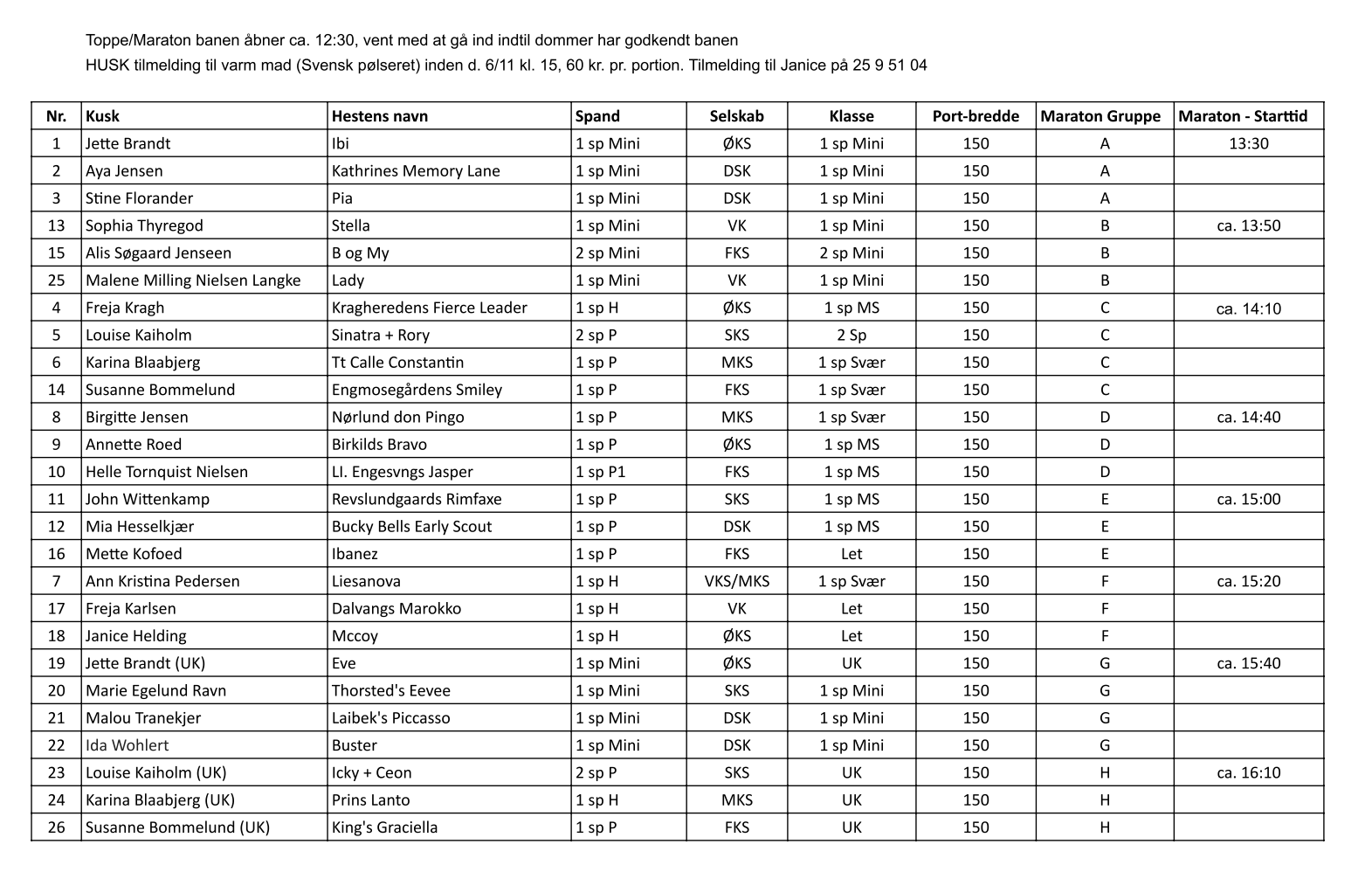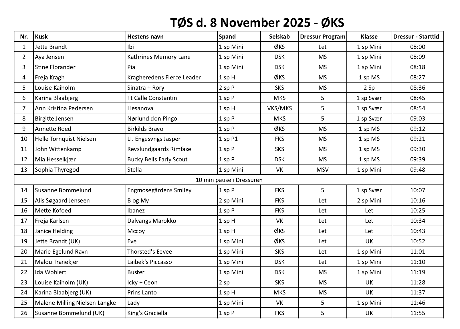 Startliste til første afdelingen af TØS turneringen 25/26 på Tørring-Uldum Rideklub på lørdag d. 8. november.