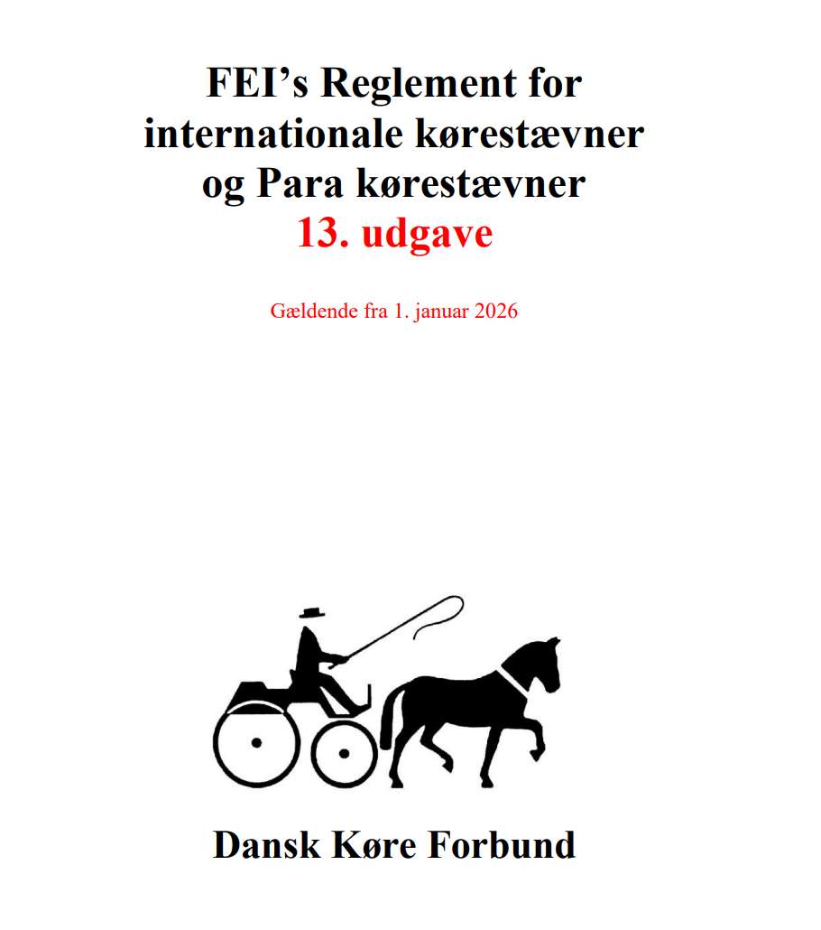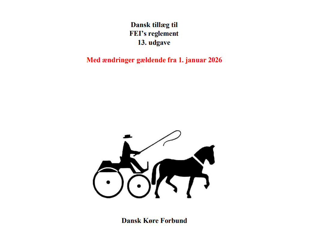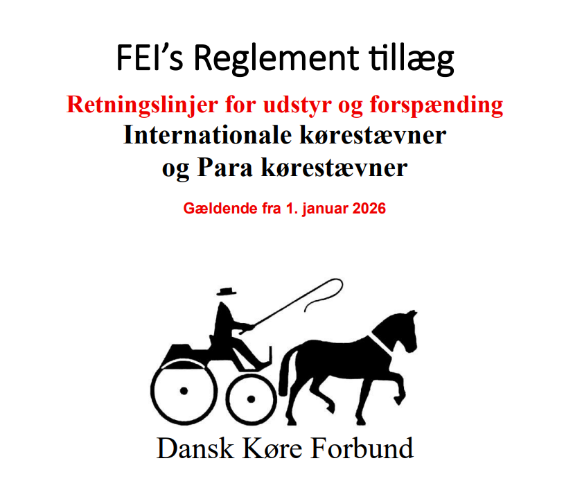 Der findes et tillæg for Danmark, som omfatter generelle dispensationer fra FEI’s reglement samt andre særlige bestemmelser, der gælder for kørestævner i Danmark. Tillægget indeholder desuden relevante informationer fra FEI’s General Regulations (GR), som ikke er dækket i FEI’s Reglement for Konkurrencekørsel.