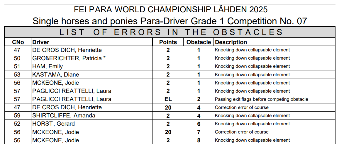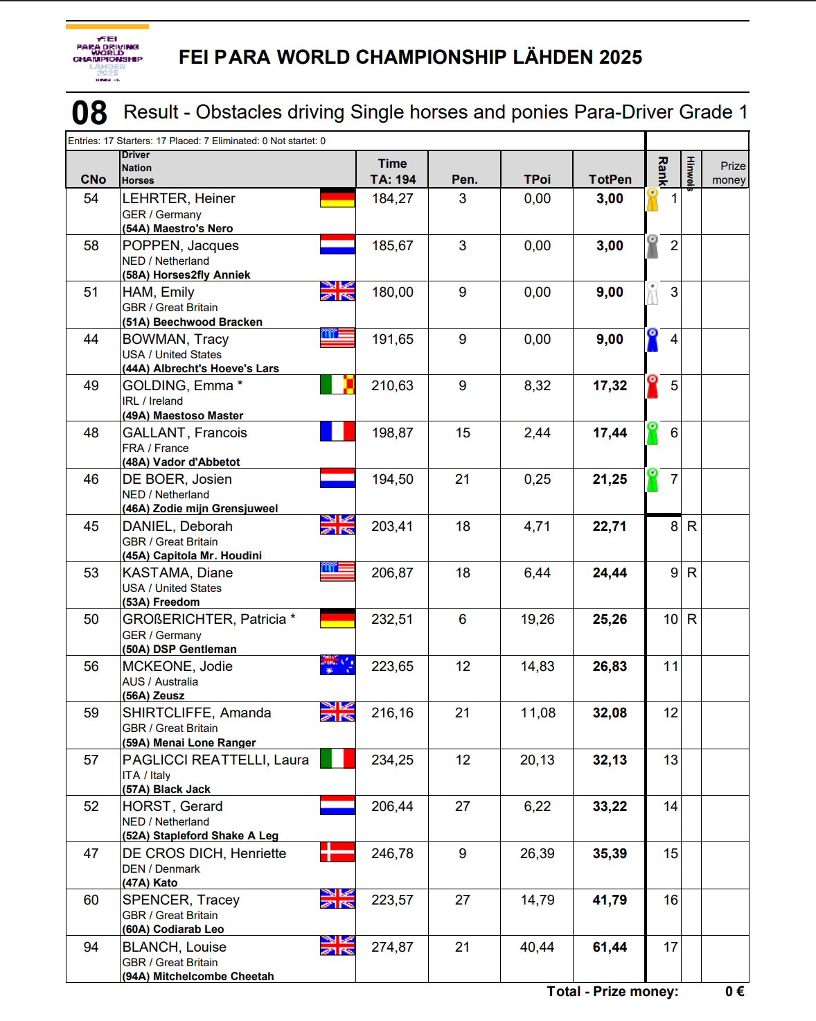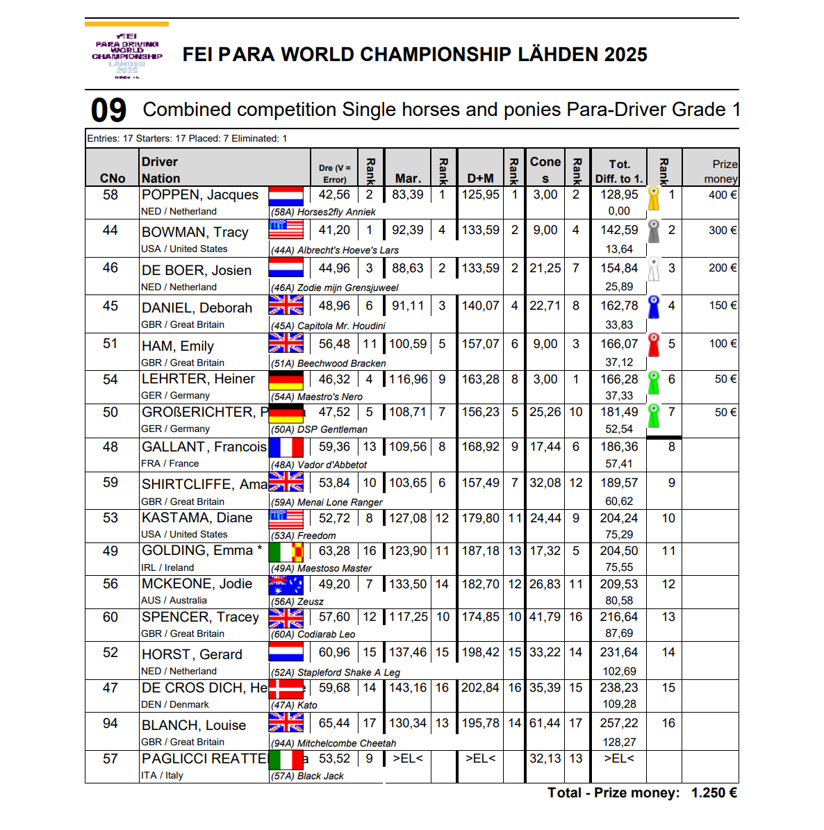Samlet resultat for VM 2025, dressur, maraton og forhindringskørsel: